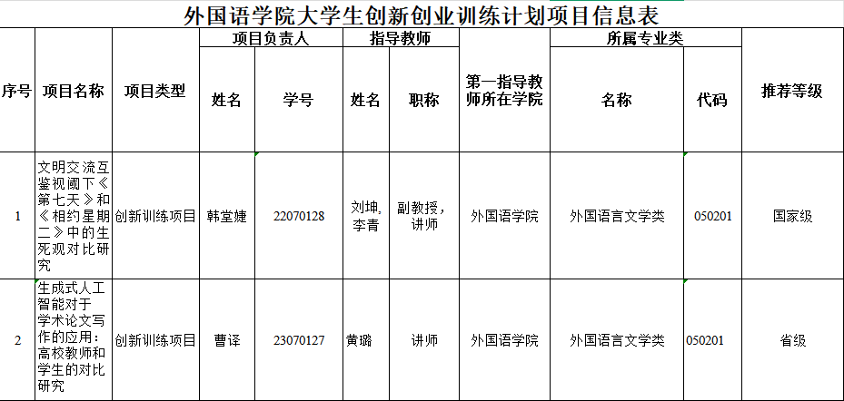 外国语学院关于2025年国家级、省级大学生创新创业训练计划项目推荐项目的公示