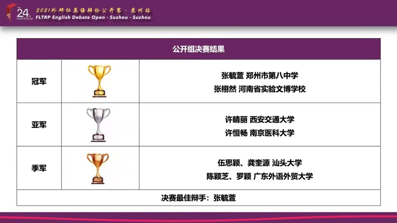 10月23至24日,“外研社·国才杯”全国大学生英语辩论赛组委成功举办2021外研社英语辩论公开赛 · 苏州站。来自全国的众多高校选手同台竞技,经过两天激烈的线上角逐,我院2019级英语专业学生许恒畅突围五轮循环赛、四强赛、总决赛,最终荣获亚军(特等奖)。