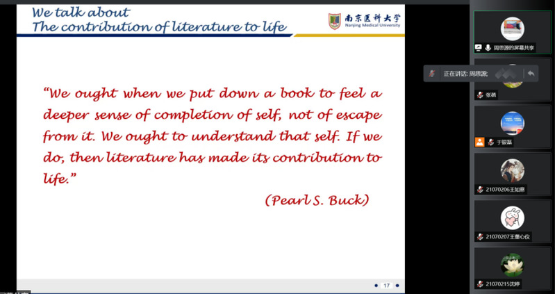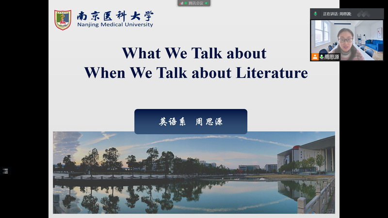 英语专业导论讲座是《基础英语》一流本科课程建设的重要组成部分,旨在培养学生专业认同感,提高专业自信力。4月19日,英语系主任周思源老师通过腾讯会议给全体21级学生作了题为What wetalk about, when we talk about literature文学导论讲座。外国语学院院长饶辉、副院长施荣根、丁海燕出席,《基础英语》课程教学团队成员李婷、张蓓、于银磊参会交流。