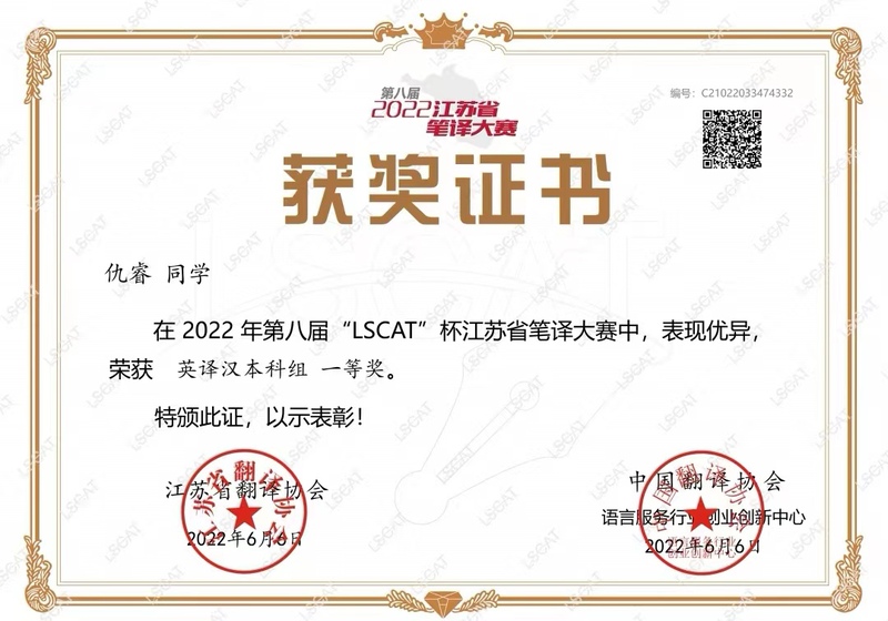 我校学子在第八届“LSCAT杯”江苏省笔译大赛再创佳绩