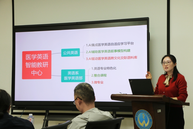 随后,周思源副院长对医学英语智能教研中心工作进行了详细部署。她指出,中心工作的谋划与组织是对国家《关于加快医学教育创新发展的指导意见》、《新版大学英语教学指南》,以及高校“双千”计划的积极回应,中心要以新医科统领医学教育创新和人工智能引领教育生态为宗旨,以“拥抱智能、深耕外语、融通医学、赋能人文”为方针,构建“医学场景化、AI 赋能、人文优势”三位一体的创新型医学英语教研模式,助力提升全校学生的医学人文素养和专业的医药国际化特色。在具体举措上,本研教学部门要统筹聚力,以建设“AI集成医学英语自适应学习平台”、“AI辅助医学英语叙事模型”和“AI驱动医学英语跨文化交际语料库”为抓手,探索教学创新,辑录优秀课堂实景视频、打造样板课程,孵育叙事医学英语教材,建设跨文化交际语料库。英语系与医学英语部要积极建设创新性整合课程,提高英语专业特色度,积极创建微专业。