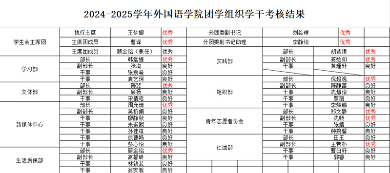 根据外国语学院团学组织队伍建设工作要求, 经个人述职、民主评议、学院审核,现对2024-2025学年团学组织学生干部考核结果予以公示:
