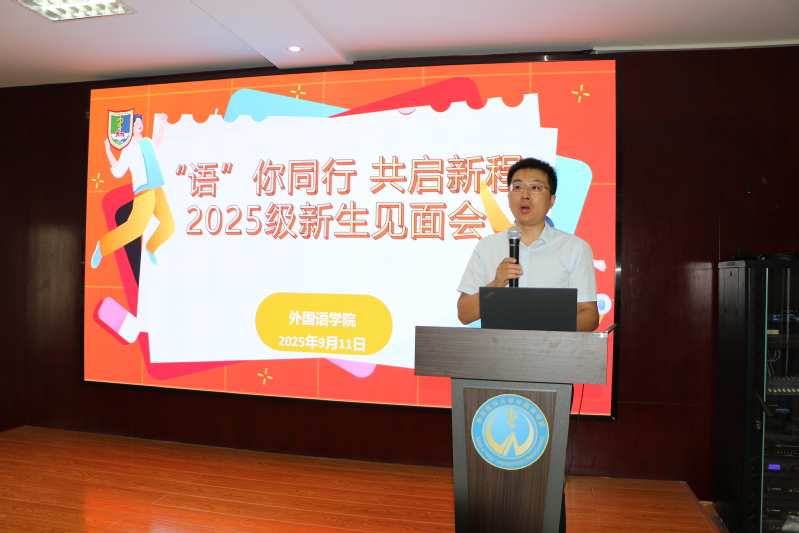 2025年9月11日上午,外国语学院在博学楼A200报告厅组织“‘语’你同行 共赴新程”新生见面会。党总支书记徐霞、副书记副院长苏益民、副院长周思源、组织员徐晔星、教研办主任林玉华、综合办主任陆丹丹、学工办主任程青曼、2018级优秀毕业生苗开欣参加新生见面会。见面会由副书记副院长苏益民主持。