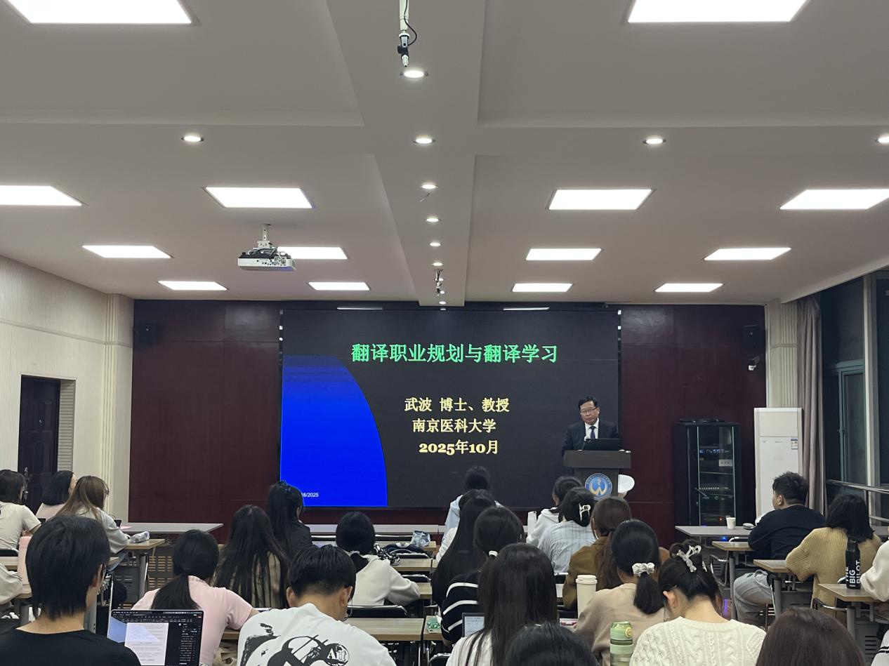 为进一步加强学生专业规划,学院特邀外交学院英语系教授、博士生导师、首届国家教委“中英友好奖学金”获得者武波教授来院为学生作《翻译职业规划与翻译学习》专题报告。他以浅显易懂的方式引入哲学思维,辅以生动的翻译案例,鼓励新生坚持翻译学习、科学规划未来,努力成为推动中华文化“走出去”的新时代语言传播者。
