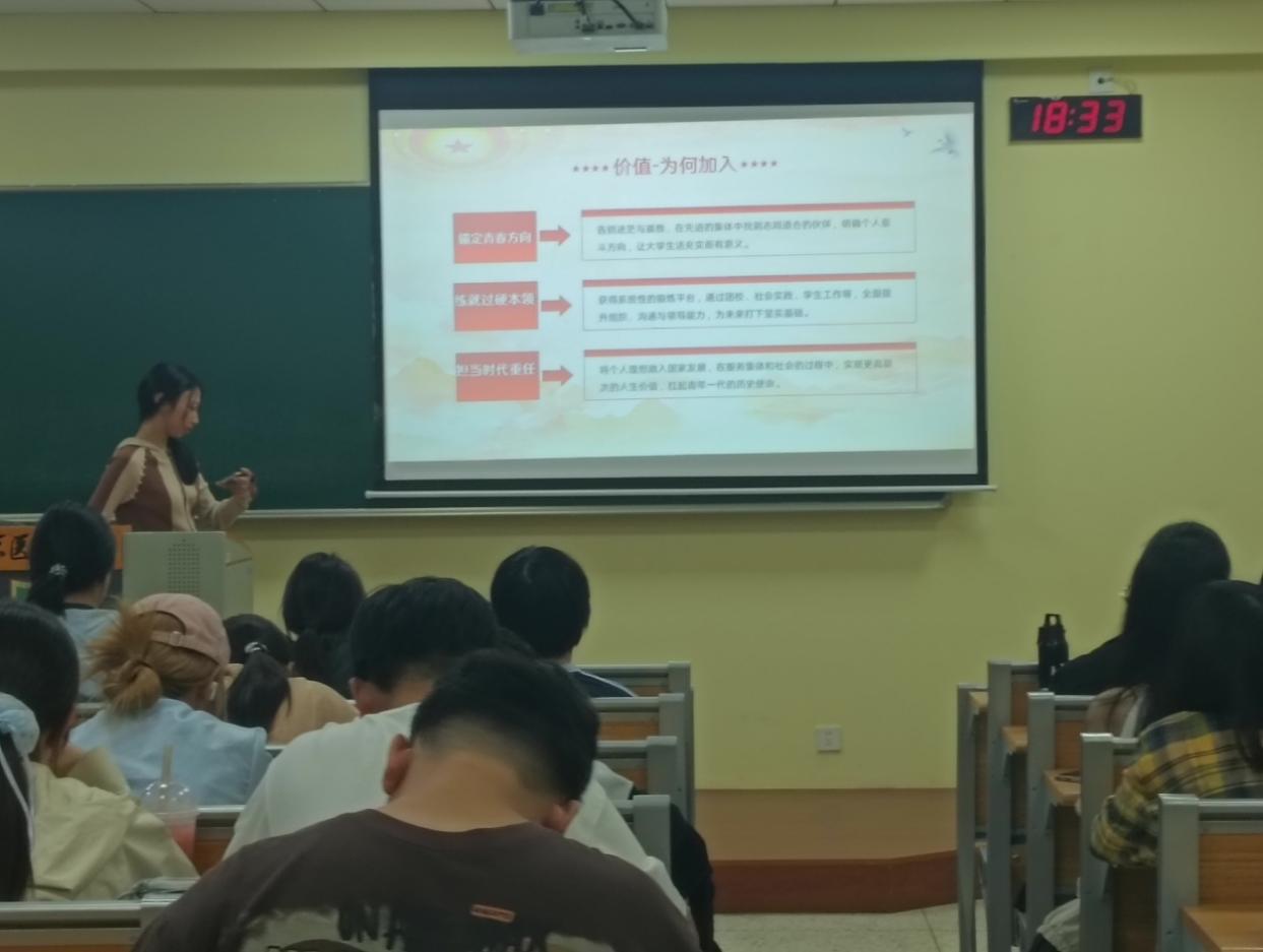 学院团学组织学生骨干深入新生晚自习班级开展8场宣讲,涵盖学业指导与规划、入党入团启蒙、大学生安全防范、“三下乡”社会实践、第二课堂实施路径、文体活动组织,从部门工作到服务宗旨,从学术支持到生活服务,从主题活动到权益保障,通过详细而生动的介绍,勾勒出学院学生管理的整体图景,使新生对未来的学习资源、活动平台和沟通渠道形成了清晰认知。现场气氛专注而热烈,同学们认真聆听、积极提问,表达对大学生活的憧憬与规划。