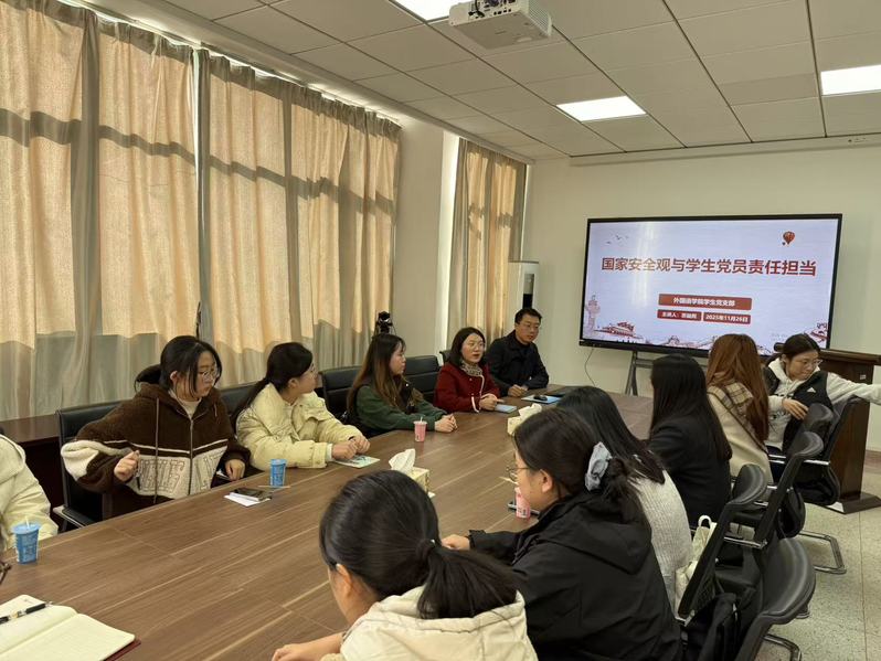 为强化学生党员国家安全意识,明确新时代责任担当,11 月 26 日中午,外国语学院学生党支部在博学楼 B211 会议室组织讲授专题党课。学生党支部全体成员、入党积极分子代表参与此次集体学习。党课由副书记、副院长苏益民主讲。