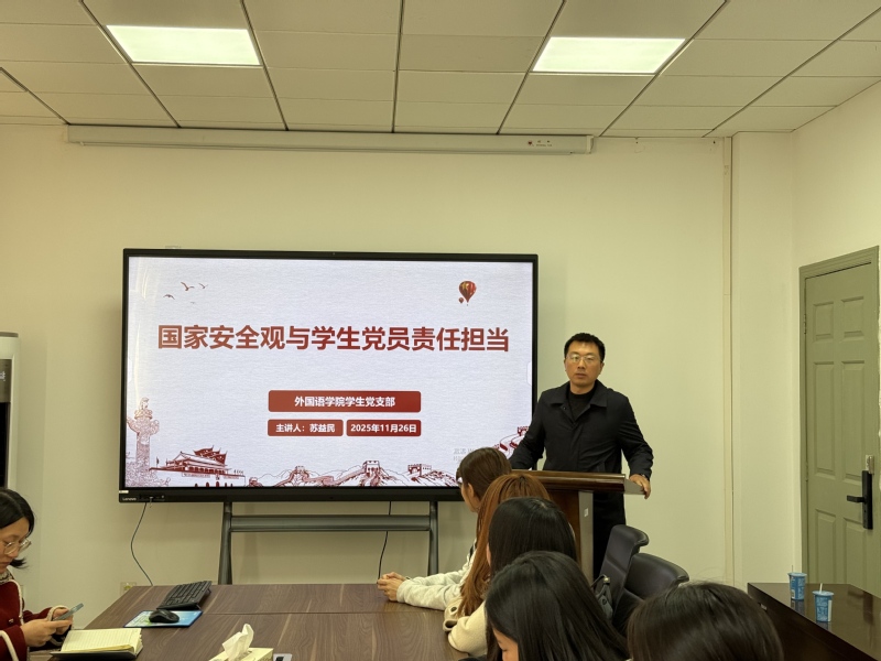 为强化学生党员国家安全意识,明确新时代责任担当,11 月 26 日中午,外国语学院学生党支部在博学楼 B211 会议室组织讲授专题党课。学生党支部全体成员、入党积极分子代表参与此次集体学习。党课由副书记、副院长苏益民主讲。