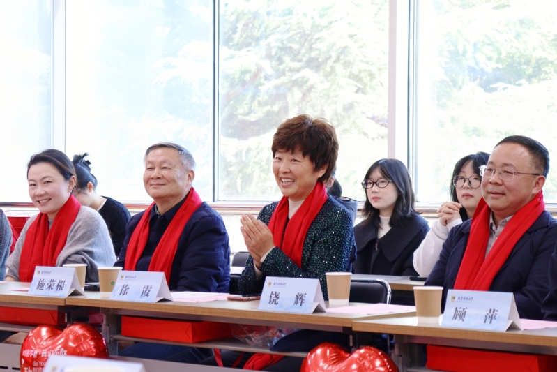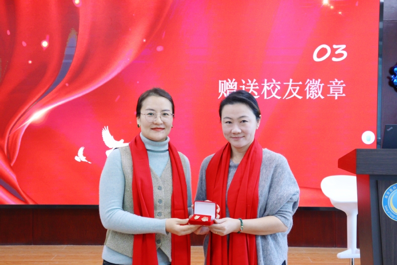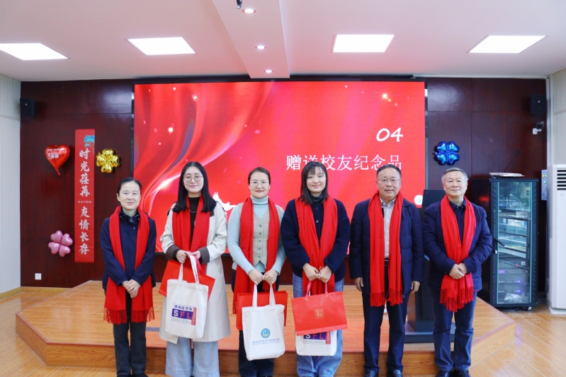 校友会总会副秘书长石丹妮向校友代表赠送校庆纪念徽章。学院原党总支书记院长饶辉、原副院长顾萍、原副院长施荣根向返校校友赠送定制纪念品。
