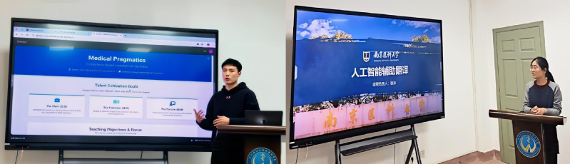 接下来,荣正浩、徐冰老师分别对《医学语用智能工作坊》、《人工智能辅助翻译》课程进行了10分钟说课和10分钟授课。两门课程富有特色,体现了英语专业与时代需求、跨学科融合的发展趋势。